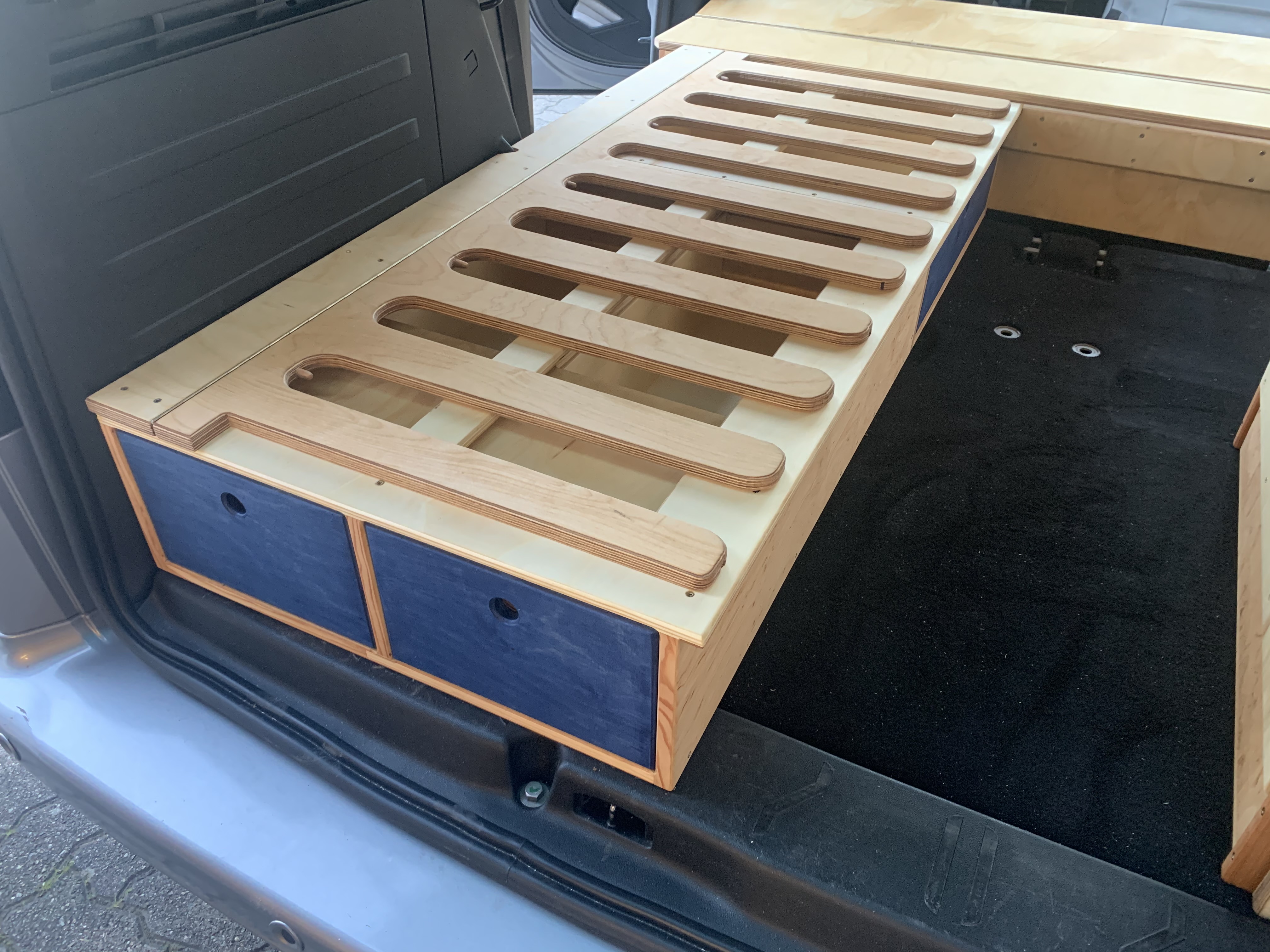 Dieser speziell entwickelte Campingausbau erlaubt es in einer Minute den Camper vom Schlaf in den Sitzmodus umzubauen. Liegefläche, ca. 195 x 130 cm. Der Heckausbau mit zwei extrem langen Schubladen mit beweglichen Abdeckungen ist im ausgezogenen Zustand auch als Stehtisch hinter dem Auto zu nutzen. Im Autoinneren sind diese Schubladen ebenfalls durch die hochklappbare Sitz-Liegebank zu bestücken. Im Fahrzeug befindet sich noch eine große Schublade mit Vollauszug für allerlei Camping-Utensilien. Der Wandschrank dient zum einen als Auflage für das Bettgestell, zum anderen als Laptop Ablage oder Tisch im Fahrzeuginnern.
