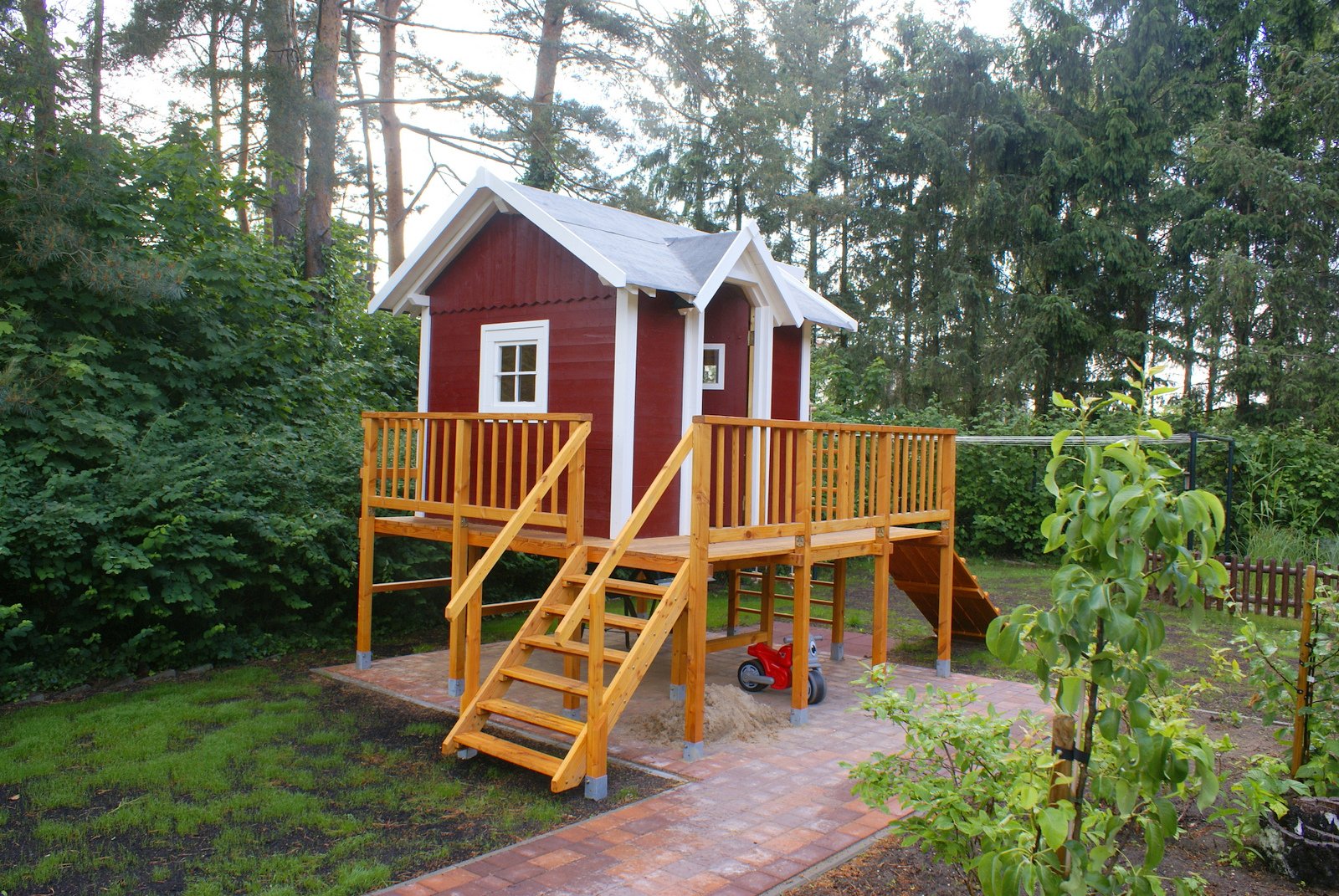 Eine supertolle Variante des Spielhauses mit erhöhtem Grundgestell und Platz für Spielgeräte und Sandhaufen unter dem Spielhaus.