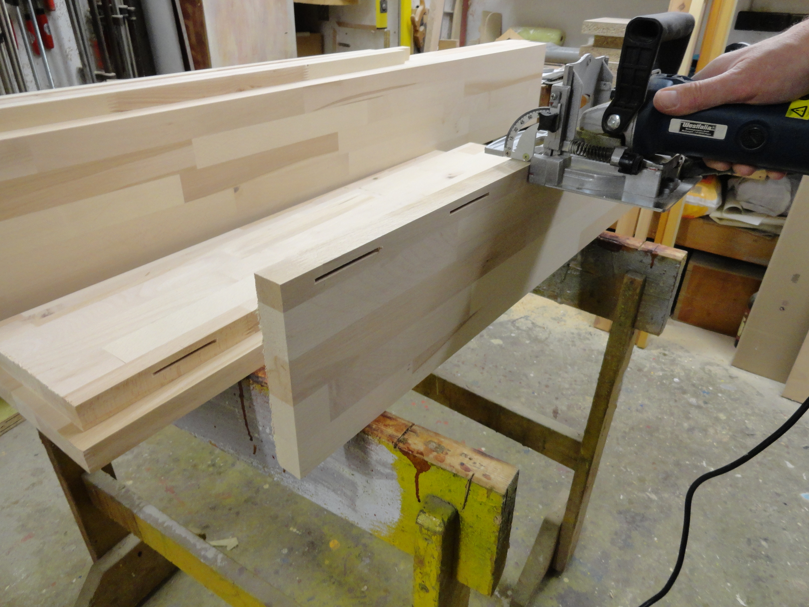 Benötigtes Werkzeug: Kreissäge, Handhobel, (oder besser Hobelmaschine) Bohrmaschiene, Akku-Schrauber, Stemmeisen, Hammer (Lamello-Gerät Baumarkt ca. 80 Euro) und einfaches Handwerkszeug.