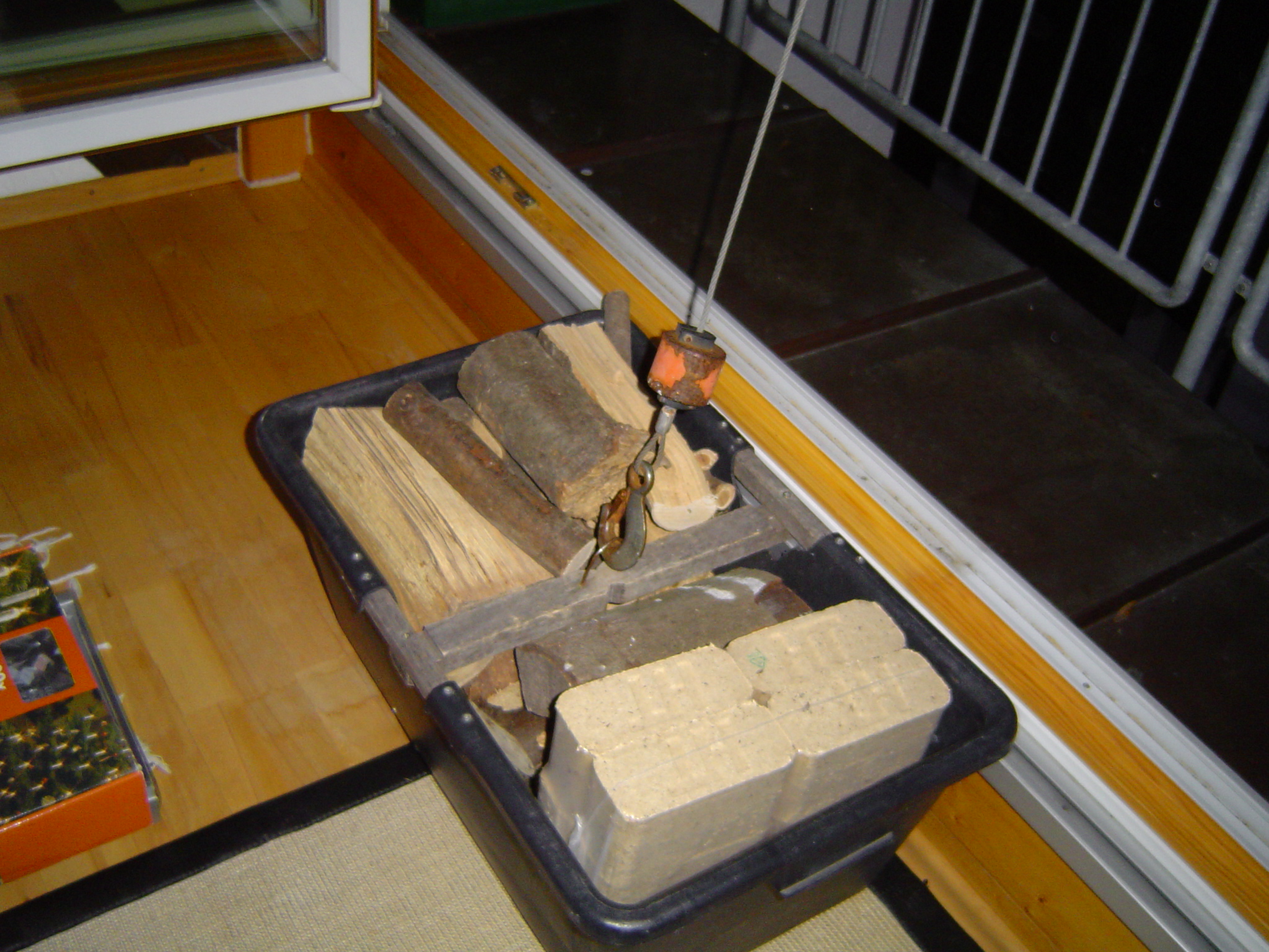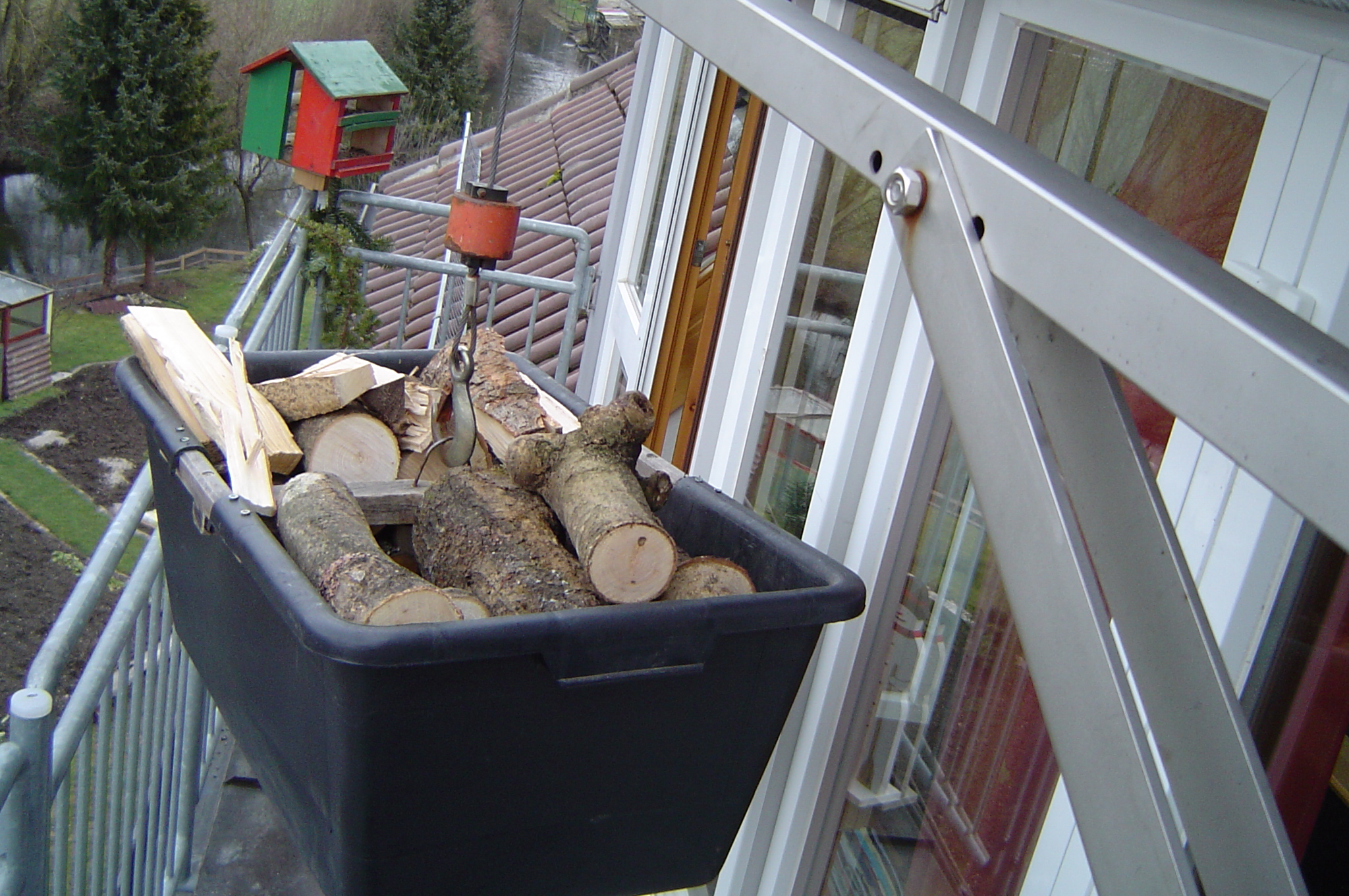 Da ich im 2. OG wohne, und immer mühsam mein Brennholz über die Treppe transportieren musste, kam mir der Gedanke einen Lastenaufzug auf meinen kleinen Balkon zu bauen, um mein Brennholz, wenn möglich bis ins Wohnzimmer zu transportieren.