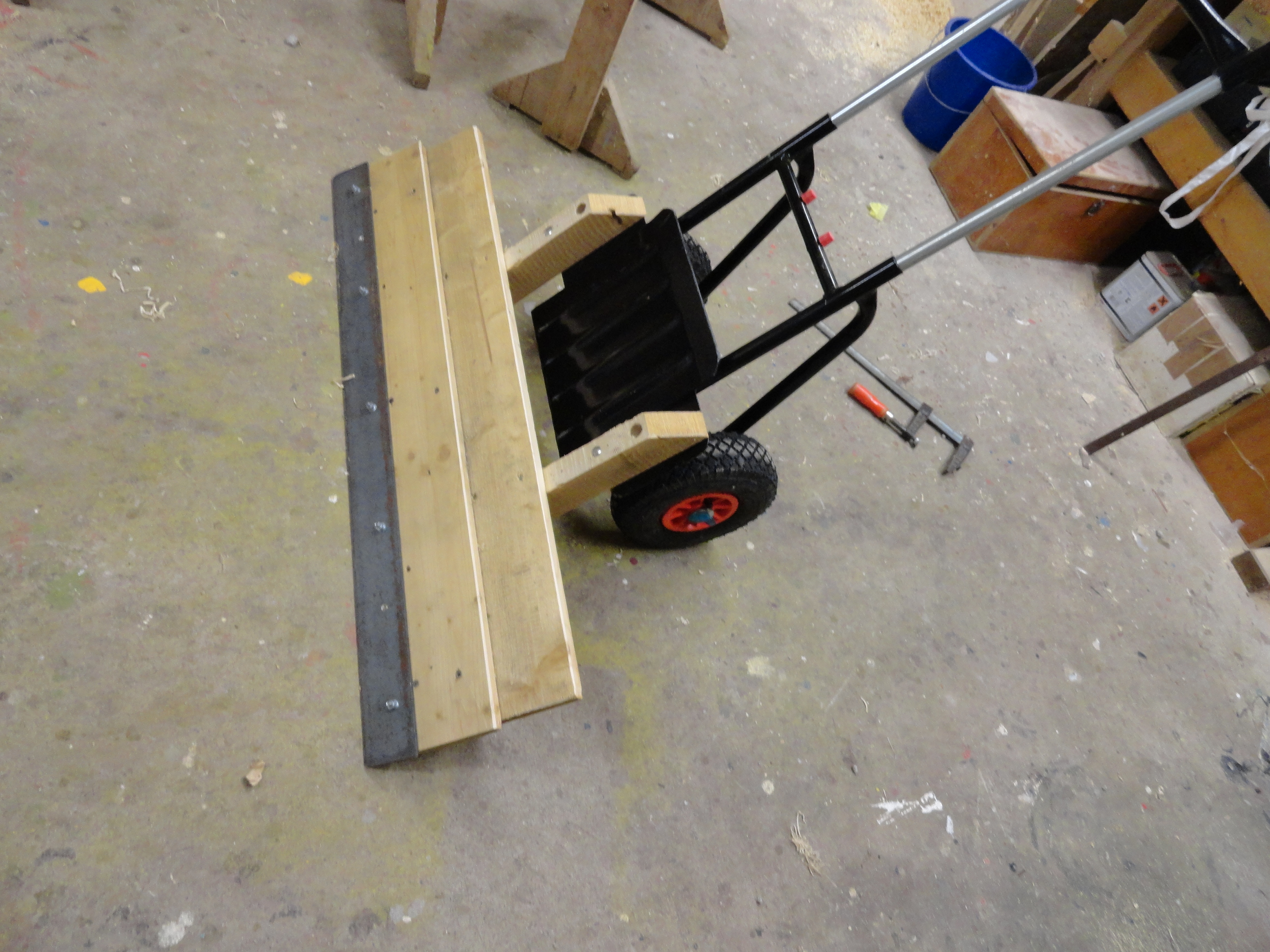 Da ich gerade den Sackkarren in der Werkstatt hatte, kam mir die Idee ihn als Schneeschieber umzubauen. Nach ca. 30 Min. war der erste Prototype fertig!